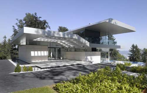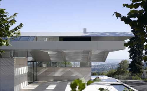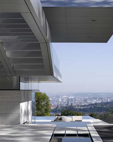 通过山上的道路可以直达建筑的主入口,主入口上方有一个伸长的悬臂屋顶。建筑朝向街道的立面采用了封闭式的自然石工设计,而相反的一面则拥有观赏城市的全景视野。