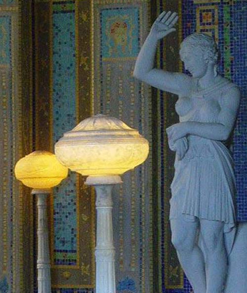 位于城堡主入口处的室外游泳池叫海王池。按照萧伯纳的逻辑,海王爷本人游泳的地方一定比这儿差远了。泳池长32米,深1米到3米,所蓄的1300吨水是从山上引来的泉水。池边散落着几尊希腊罗马神话传说中的人物雕像,全部是艺术珍品。室内游泳池叫罗马池,是世界最豪华的泳池。墙壁、池底、岸边、跳台等用了1500万块在威尼斯制造的玻璃马赛克拼贴表面。金色的玻璃马赛克表面贴的是一层真金。单是生产这些马赛克就花了一年3个月的时间,整个泳池的修建则历时3年。