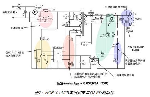 图2是安森美公司NCP1014/28离线式第二代LED驱动器的电路图,其中,蓝色部分为恒定电流电路,此外还设有最高电压钳制电路,保证输出电压不会超出设计电压范围,确保安全。NCP1014是一款离线脉宽调制(PWM)开关稳压器,具有集成的高压MOSFET,当采用通用交流线路供电时,最高能够提供8 W的输出功率。其中,NCP1014 LED驱动器是完全隔离的交流-直流转换器,针对恒流应用进行了优化。NCP1014/NCP1028采用350 mA/22V直流变压器设计及700 mA/17V的直流配置。需要说明的是,如果针对230 V交流线路使用另一种可选变压器,则该转换器能够提供高达19W(NCP1014)或25W(NCP1028)的功率。