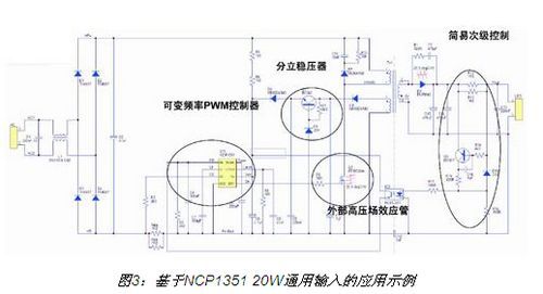 在一些更大功率的应用中,如大于15W的设计,一般单芯片驱动器会有功率限制,所以可以考虑用分立的方法来实现。在图3的应用中,用NCP1351加上一个新的MOSFET,做成一个驱动器,它能支持350 mA至1 A的恒流。在设计中应用NCP1351,它采用了可变频率控制器,在轻载或无负载状态下,开关频率很低,启动时具有非常低的电流损耗和很高的效率。此外,在输出部分,还增加了恒流电路和最高电压控制电路。
