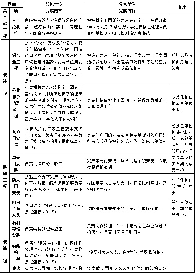 项目总承包单位与各专业分包单位的施工界面划分是非常清晰的,甲方在项目招标过程中已经将总承包的施工范围及专业分包单位的施工范围进行明确,大体如下: