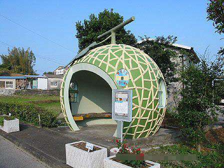 这是日本的水果公交车站,有网纹瓜、草莓等多种造型,制作非常精细,比如瓜面的网纹、草莓表面的黑点。