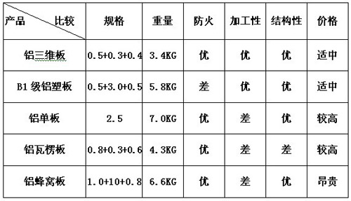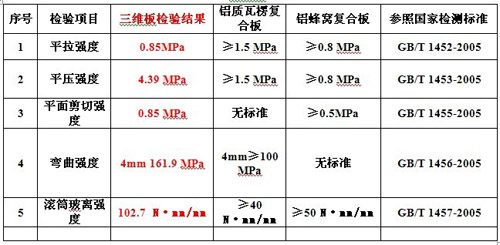 三维板与铝质瓦楞复合板、铝蜂窝复合板物理性检测标准比较表