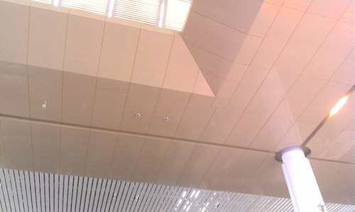 使用在吊顶时,由于轻~薄~强,分格可尽量大体展现,不需像使用铝单板时得考虑 重量安全 板面下垂等因素,每平米仅3.5kg/m2,且成本较传统铝单板经济。