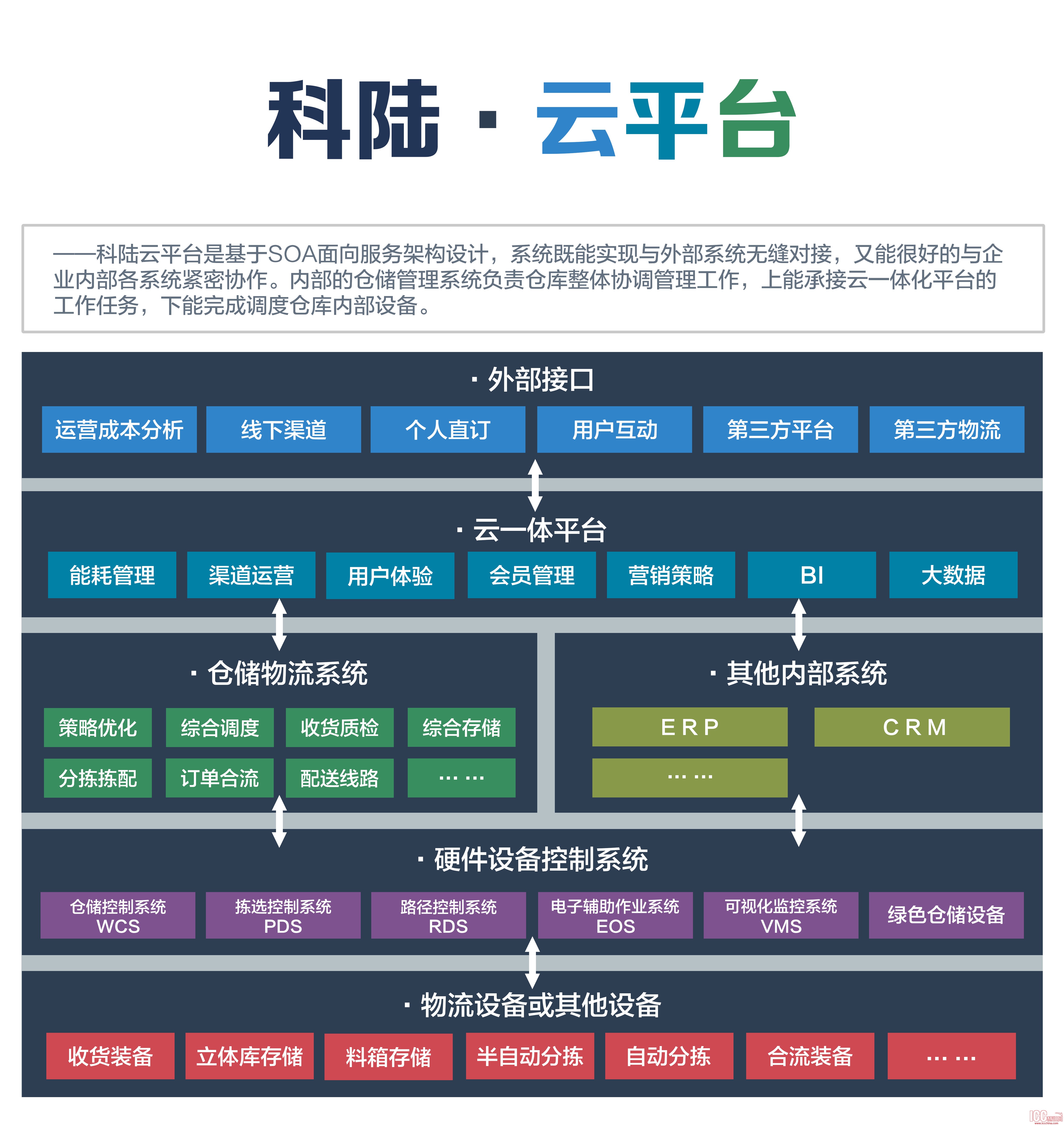 科陆云平台是基于SOA面向服务架构设计。内部的WMS系统负责仓库整体协调管理工作,上能承接云一体化平台的工作任务,下能完成调度仓库内部设备。如自动存储系统——自动托盘/料箱立体库, 基于穿梭车技术的立体存储系统;快速拣选业务单元,如电子标签拣选系统,语音拣选系统,自动货到人拣选工作站;自动输送设备,如自动托盘/料箱输送机、轨道/自动穿梭车;自动路向分拣机;RF车载/手持终端设备等。 18/
