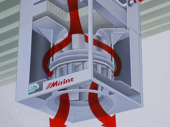 Mirine瑞繁(北京)高大空间空调循环机组:包括外壳、过滤器、板式表冷器、冷凝水挡水板、风机、空气布送器和电动执行机构,过滤器、板式表冷器、冷凝水挡水板、风机和空气布送器从上至下依次设置在外壳内,冷凝水挡水板四周连接有接水盘;冷凝水挡水板由多个横截面呈“S”形的挡水片平行串联组成,各挡水片之间留有间隙,可将经表冷器冷却的冷风顺利排出,且挡水片的各挡水面呈弧形设置,不会对排风造成很大的压力,有利于风机的正常运行。此种高大空间空调采用吊顶式安装、一般安装在厂房、体育馆的钢结构顶棚上,打破了传统风管+风口的布风模式,安装模式多样等特点均赋予了暖通工程师新的创作空间和传统的壁挂式风机盘管以及暖气片无法达到的采暖制冷效果。