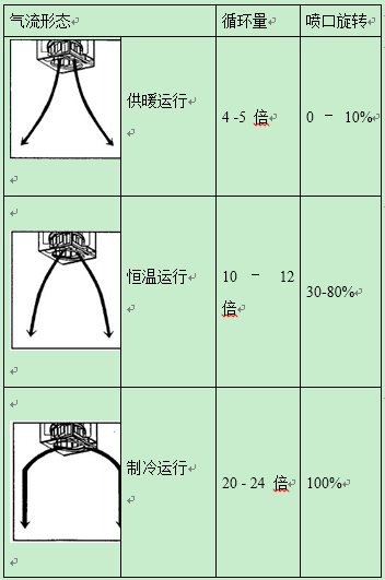 依据不同的运行方式,调节空气布送器喷口的角度,诱导设备周围空气循环量成倍增加。