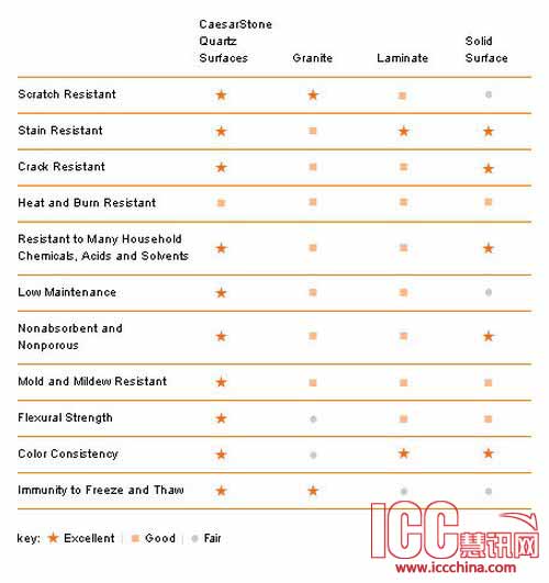 Caesarstoneus天然石英石台面是自然和科技理想结合的产品。产品具有无孔、防划痕、耐污特性,无需粘合剂、蜡和特殊维护,即可维持恒久美观。Caesarstoneus天然石英石台面非常适用于室内装饰,与花岗岩台面相比,具有四倍的弯曲强度和双倍的抗冲击强度,性能明显优于大理石产品。