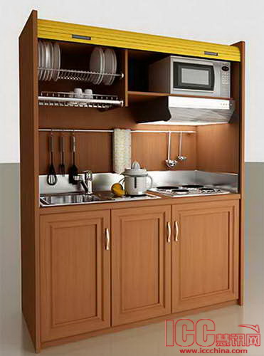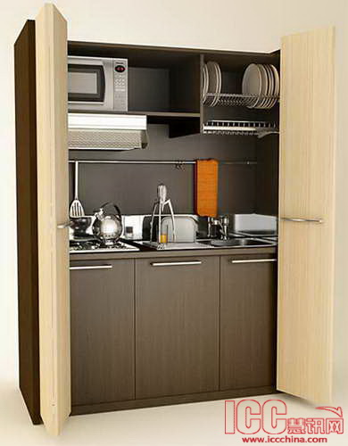 Mobilspazio Contract迷你厨房的所有部件包括冰箱、带有煤气和电气装置的炉台、水池、滴水板、龙头、虹吸、垃圾箱、盘碟晾干架、油烟机、防水不锈钢操作台面。迷你厨房系统安装操作简便。