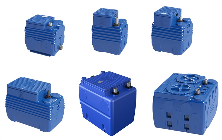 一体化污水提升装置BlueBox是高效、经济的地下污水解决方案,专门用于收集和提升不能依靠重力自流至市政排污管道的污水,根据需要可配套涡流泵和切割泵。BlueBox箱体为聚乙烯材质,按型号可分为60、90、150、250S、250Plus、400S、1000七类,其中60、90、250S配1台泵,150、250Plus、400S、1000可配2台泵。