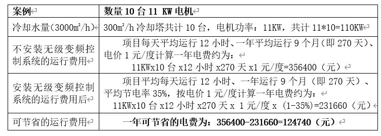 冷却塔最大负荷是按照一年中最热的月份中午时段设计的。在早、晚时间段,以及春、秋、冬季不需要这么多负荷。多出来的负荷就可以通过变频系统变频,降低电机和风机转速来实现降噪、节能、减少漂水。单梁ABB智能无级变频系统控制精度高,保证了不同时段多余的负荷量与变频减少的负荷量高度一致,才会出现完美结果。控制方案及原理图我司会为有需要的客户单独提供。该系统也为客户配备了BA接口,可以实现远程智能控制。
