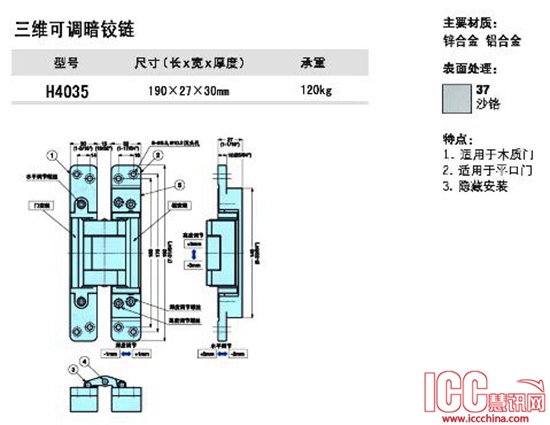 H4031是CANOVO凯诺威推出的新型隐藏式三维可调合页,这三款合页其突出的承重性能和安装方便的特点为用户在重型室内门的合页领域提供了新的选择。