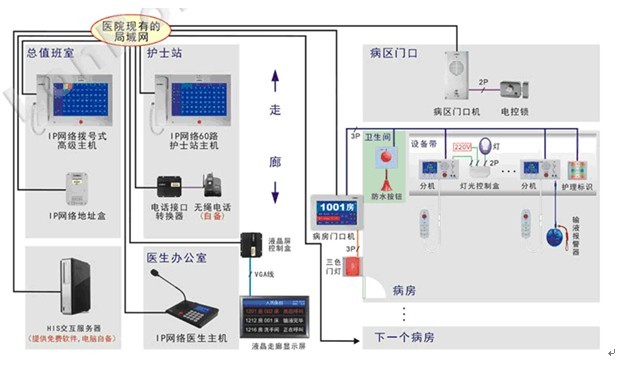 护理增援呼叫:病床分机支持护理增援呼叫。医护人员按分机上的“增援”键,可呼唤增派医护人员。