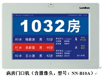 病房门口机:采用全触摸屏操作,可显示病房内病人信息、责任医生名称及相片、责任护士名称及相片。