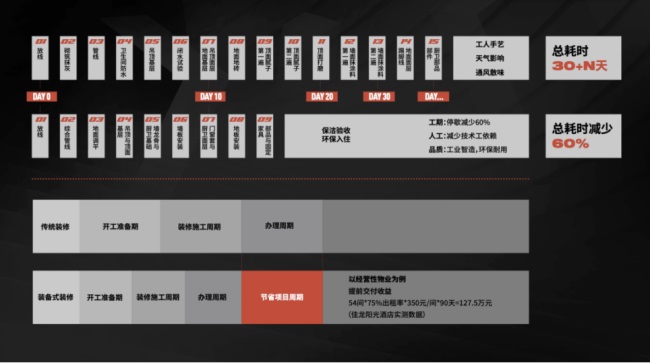 地产或者酒店一旦确定使用装配式装修,就可以工厂现场两地同步进行,工期可缩短70%以上。传统装修三四个月的工期,装配式30天就能完成,提升了装企同期运作多个工地的能力。