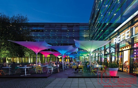 MDT郁金香形遮阳伞可以通过灯光照明呈现多种颜色,营造所需的氛围,而且伞体图案可以定制,有助于提升公共或私人活动的效果。