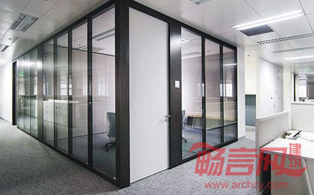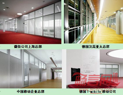 玻璃隔断:元素铝合金龙骨框架,双层钢化玻璃在工厂专业清洗,隔断系统面板的安装在工厂内完成以保证其质量 。
