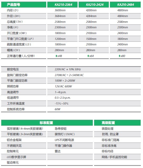 独特的结构设计:突破了传统自动旋转门设计模式,取消中轴,采用环形轨道和风车状门翼,确保在任何情况下旋转自如; 旋转翼内两门扉可固定,亦可自动平滑,还可以手动推开,形成宽度等于大门半径的疏散通道,并带有遥控功能,此设计增强抗风能力, 消除风口效应;采用毛刷密封,有效的阻挡了风尘,噪音和废气进入室内,充分发挥了门的隔离作用和疏散作用,给人以美观舒适感。有两种工作方式可供人们自由 切换:寒冬,酷暑和风沙时,可采用旋转方式,减少冷热交换,以节约能源;当室内外温差较小或行人流量较大时,可选用平滑门方式,以增加流量,使通行更快捷。