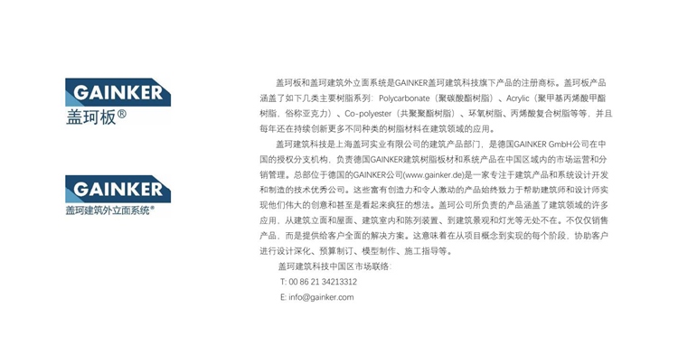 盖珂建筑科技是上海盖珂实业有限公司的建筑产品部门,是德国GAINKER GmbH公司在中国的授权分支机构,负责德国GAINKER建筑树脂板材和系统产品在中国区域内的市场运营和分销管理。总部位于德国的GAINKER公司(www.gainker.de)是一家专注于建筑产品和系统设计开发和制造的技术优秀公司。这些富有创造力和令人激动的产品始终致力于帮助建筑师和设计师实现他们伟大的创意和甚至是看起来疯狂的想法。盖珂公司所负责的产品涵盖了建筑领域的许多应用,从建筑立面和屋面、建筑室内和陈列装置、到建筑景观和灯光等无处不在。不仅仅销售产品,而是提供给客户全面的解决方案。这意味着在从项目概念到实现的每个阶段,协助客户进行设计深化、预算制订、模型制作、施工指导等。