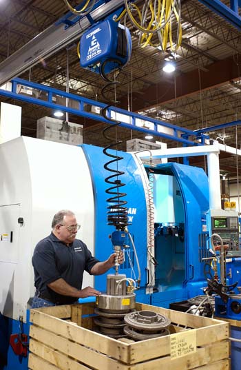 客户选择高博Easy Arm™智能性提升装置。它臂长4.3m,钩下高度3m,由Industrial Magnetics公司提供夹具,配合远程安装滑动手柄使用。