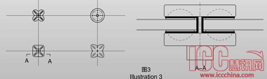 该公司研制的铰接型夹具是在夹具和玻璃之间采用铰接结构(如图3),球铰中心基本在玻璃的厚度中心。专利号:ZL 2010 2 0505575.6。依据点支式幕墙玻璃变形的大挠度理论,玻璃受风荷载作用产生允许的变形,而玻璃的应力却大大降低。