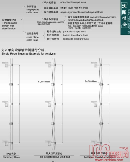对于单索幕墙其挠度限值为L/45--L/80,其单向索幕墙玻璃转动角度一般约为±15°,单层索网幕墙玻璃转动角度一般约为±8°,对于双层索幕墙其挠度限值为L/200,其玻璃转动角度一般约为±5°。