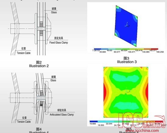 因此在拉索幕墙中,无论是单向索、单层索网,还是双层索幕墙,采用球铰夹具固定玻璃相对于传统夹具可以使玻璃应力大幅度下降,降低玻璃的厚度,节省工程造价,并提高了幕墙的安全性。