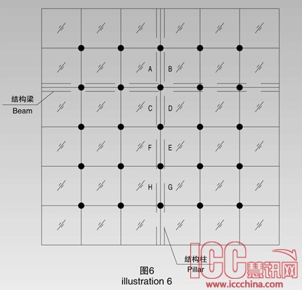 图6中结构有梁和柱,玻璃A、B、C、D有三点固定在刚性结构上,另一点固定在柔性结构上,拉索的变形引起玻璃四点不共面。玻璃E、F、G、H有两个点固定在刚性结构上,另两个点固定在柔性结构上,拉索的变形引起固定在索上的两个点变形不一致,也导致了玻璃四点不共面。其实索网结构在受到荷载变形时形成了一个双曲面形状,相当于四边形平板玻璃模拟双曲面,因此玻璃四角不在一个平面上。这种扭曲会引起玻璃应力大幅度增加。这种变形在计算玻璃强度时往往没有计算进去。如果采用球铰夹具,玻璃四角允许转动,会让玻璃四角应力大幅度降低,有利于玻璃的安全使用。