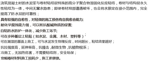 施工性:潮湿基面即可施工,不受现场建筑几何图形限制,与基层有很好的附着力,解决了窜水隐患。