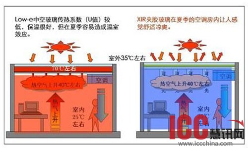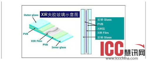 XIR超节能夹胶玻璃是指Glass+PVB+XIR膜+PVB+Glass。 XIR是一种源于美国韶华科技的薄膜技术产品,其卓著性能表现为对太阳光中可见光、紫外线及红外线的选择性处理,达到取用户之所需、摒用户之所弃的极佳节能、舒适效果。具有“反热不反光”的特性,达到很强的遮阳效果。