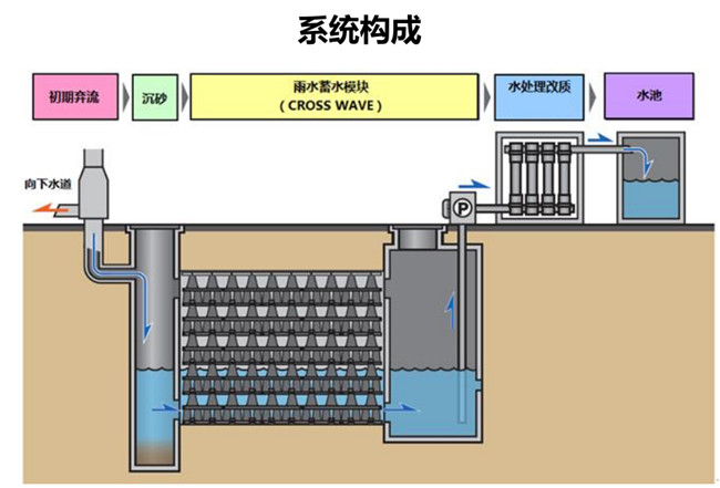 积水CROSS-WAVE雨水收集利用系统,是日本积水化学集团技术,在日本得到广泛应用,市场占有率高达50%以上,广泛应用于各种建筑与小区、 学校、绿地、停车场、公园、道路、公共基础设施等有雨水收集要求的区域。它以储水模块为主体,根据用户的不同需要及工程特点,通过初期弃流、沉砂、储水模 块集水、水处理改制等工序,向用户提供多种系统解决方案,实现雨洪调控、雨水回用、补给涵养地下水源等功能,真正实现让城市回归自然。