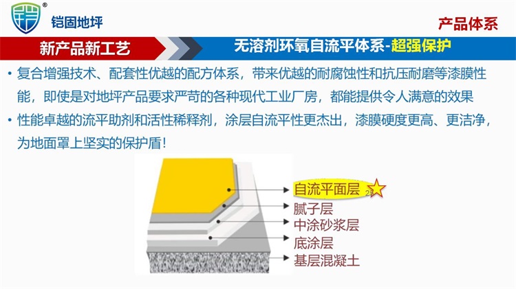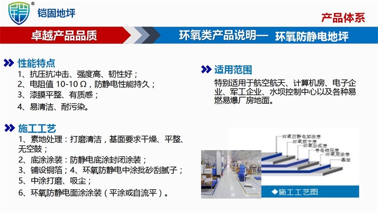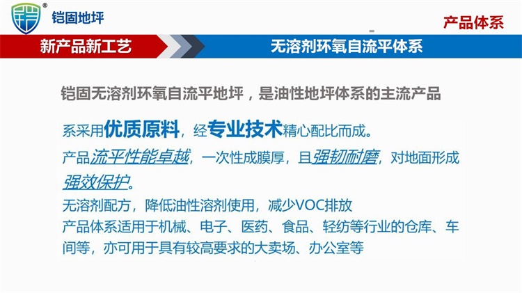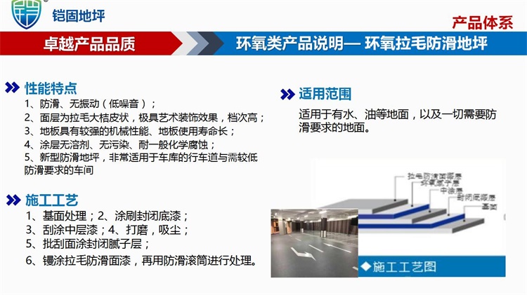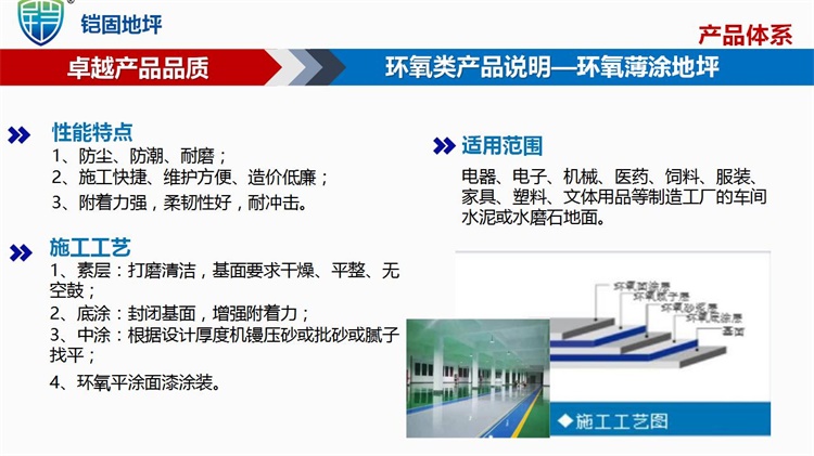 本公司研发生产的高级环氧树脂地坪漆,环氧自流平,导静电自流平,防滑坡道,地面硬化剂,耐磨地坪等产品被广泛应用于制药,电子,食品,军工,机械,仓库,物流,码头,地下车库等地面施工领域;公司凭借强大的科研生产实力和优良的施工品质,完善的售后服务赢得了广大客户企业的广泛应用和信赖。