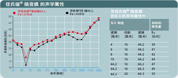 佳氏福®隔音PVB是一种具有出色的降噪性能的PVB膜。与标准PVB做成的夹胶玻璃相比,佳氏福®隔音PVB膜可以将隔音值提高约3分贝。用佳氏福®隔音膜生产安全夹胶玻璃的工艺与生产建筑玻璃的标准产品一样简单高效。佳氏福®隔音PVB膜不但具有优异的隔音性能,还有与佳氏福标准建筑PVB一样的安全性和光学性能。