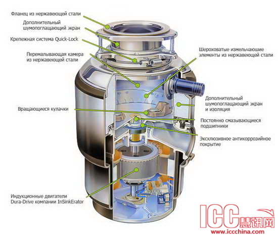Emerson ISE爱适易食物垃圾处理器Evolution200作为Evolution系列中的高端产品,材质采用不锈钢,采用感应交流电机,高度约为34.4厘米,内部为不锈钢研磨室(1180ml)和用以处理垃圾的研磨元件。产品具有良好的密封性,因此笔者无法对其进行内部拆卸,从产品构造图上可以看出这款食物垃圾处理器通过三级不锈钢研磨系统研磨垃圾,并且研磨系统具备自动反转功能,研磨环上下内外经巧妙设计,搭配固定推进器和旋转推进器,确保食物残剩在短时间内迅速研磨成细小颗粒。