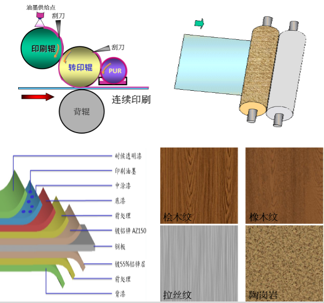 1.利用辊涂凹板印刷制程,将设计图案或颜色转印到漆膜面上,使烤漆钢板具有图样或第二颜色,延伸钢板多变化的外观质感;