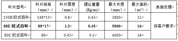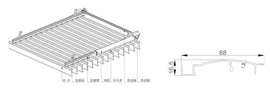 百叶面板采用优质铝合金板材为基材,再经过数控折弯等技术成型单层铝合金叶片,根据需要可使用不同厚度,宽度的叶片,不同的开孔率保证一定的透光率和不同的遮阳效果。欧式百叶遮阳系统采用高强度88E铝合金叶片,叶片呈弧形,叶片分为电动和固定两种,电动可调角度在0-105°,可水平和垂直安装.,通过电机来带动百叶片的翻转角度,不同角度具有不同的遮阳、调光、通风、防雨、防风、防尘效果。