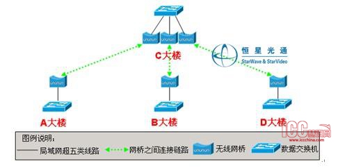 2、各监控点的网络摄像机先通过有线方式集中到一起,然后,统一通过无线网桥传到网络中心局域网的网络视频服务器上,再经交换机通过内部局域网传播至各个相关部门或人员的客户端。