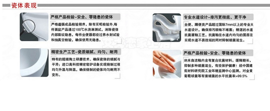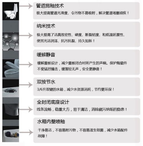 1、自洁釉技术使用专用釉料,所形成的陶瓷表面比普通陶瓷表面更平滑,并产生“纳米小规格效应”,让纳米小颗粒填充到肉眼看不到的凹凸内,使得污垢和细菌无藏身之地,清洁起来易如反掌。 虹吸式座便器采用流体力学中虹吸原理,在启动冲水装置后,排污管道瞬间产生强大负压,从而抽走污物,同时由于设计成50MM以上水封高度,故拥有冲洗功能好,又具有良好的静音隔臭效果。 采用缓降盖板