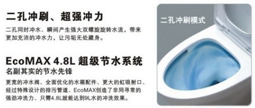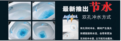 5、所有座便器均是六升节水型环保产品,均采用了能三秒快速排污的喷射虹吸式冲水方式,产品两档冲水设计,迎合环保节水潮流。
