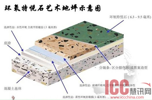 环氧特悦石(Terrazzo)是一种精选多种特制的石材类、金属类或其它装饰性骨材与环氧等高分子树脂相混合,经特殊工艺现场施做完成的以“平整无逢”、“色彩绚丽”、“图案精美”、“表面纹理均匀”、“光亮耐磨”和“经久耐用”为特点的高装饰性艺术地坪。