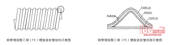 钢带增强PE螺旋波纹管是一种PE与钢熔复合的结构壁管。管壁结构由三个层次构层:内层是一个连接实壁PE内层管,内层管外缠绕复合有用钢拆成倒“U”型的环形波状钢板增强体,在涂复波状钢板增强体外复合有与钢板增强体波形相同的外层PE。