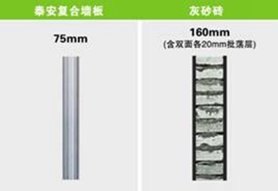 按国家建筑隔墙条板的规范,用泰安复合墙板75mm和100mm的板分别可代替传统的120mm的砖墙和180mm厚的砖墙。75mm厚的泰安复合墙板与120mm的砖墙加抹灰后的厚度160mm相比足足少了85mm,显而易见,使用泰安复合墙板系统,建造10~12m延长墙体可增加1m2的使用面积,使用率增加4~6%,所增加实用面积价值高于墙板造价,所以泰安复合墙板非常适合于商铺及住宅的隔墙及分户。此优点在松本板业众多大型项目中得于证明。
