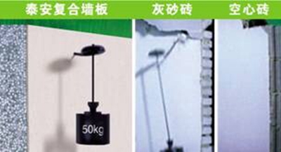 泰安复合墙板可以直接打钉或上膨胀螺栓进行吊挂重物,如空调机、吊柜等,单点吊挂力在50kg以上;干挂大理石的骨架可直接承受在墙板上。