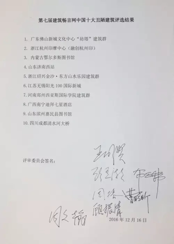 2016年12月16日,第七届建筑畅言网中国十大丑陋建筑评选终审会在北京成功举行。作为对未来中国建筑发展的启示和中国建筑界的正能量与风向标,本届终审过程中,中国艺术研究院建筑与艺术史学者、著名建筑评论家王明贤,中国建筑学会教授级高级建筑师、著名建筑评论家顾孟潮,中房集团建筑设计事务所资深总建筑师、著名建筑师布正伟,清华大学建筑学院副教授、著名建筑评论家周榕,中国建筑设计研究院副总建筑师、著名建筑师曹晓昕,著名艺术批评家、策展人顾振清,著名文化批评家周文翰等业界权威专家参照事先制定好的评选标准,通过深入研究与探讨、反复忖度与推敲,评选出第七届建筑畅言网中国十大丑陋建筑的最终结果,它们分别是:广东佛山新城文化中心“坊塔”建筑群、浙江杭州印摩中心(融创杭州印)、内蒙古鄂尔多斯图书馆、山东济南西站、浙江绍兴金沙·东方山水乐园建筑群、江苏无锡阳光100国际新城、河南郑州西亚斯国际学院建筑群、广西南宁迪拜七星酒店、山东滨州惠民县图书馆、四川成都清水河大桥。在此,建筑畅言网特向各位专家、学者在评选中所展现出的专业态度和敬业之心,表示衷心的感谢!