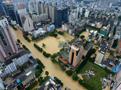 10月18日,海南琼海,台风带来的暴雨造成大水浸街,万泉河水暴涨。目前沿河市民正严阵以待准备抗击洪涝灾害的发生。