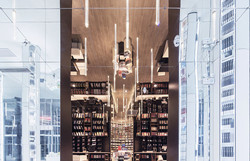 与它平行的空间是书店的主体,书架围绕着四周的墙排列,中间留出来的空地摆放了一串桌椅,从不同角度看都呈现出左右对称。棕色的书架设计成倾斜的,在镜子里反射出魔幻的图形,这里的深色调与纯白色的空间产生强烈的对比,也给人强烈的视觉冲击。