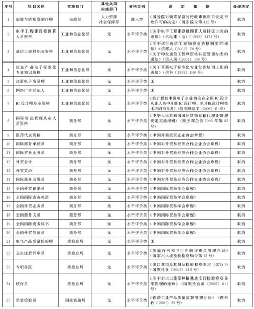 人民网北京7月23日电 据中国政府网消息,国务院决定取消62项职业资格许可和认定事项,包括专业技术人员职业资格许可和认定事项25项、技能人员职业资格许可和认定事项37项。