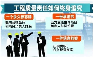 《条例》规定,建设单位在工程竣工验收前,应通过设置永久性标识,对五方责任主体和项目负责人进行公告公示,一旦房屋质量出现问题,将追究相关人员的责任。这意味着今后“楼倒倒”“楼脆脆”等质量事故的责任人,将终身难逃其咎。