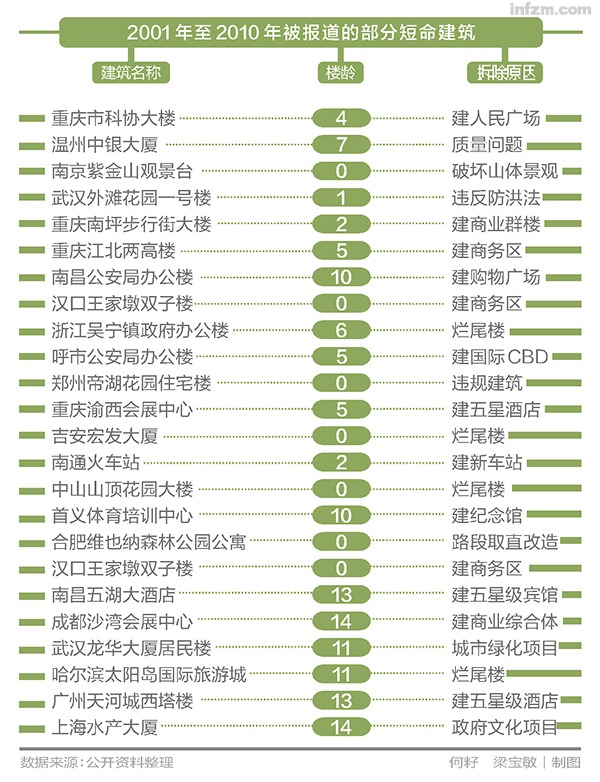 2012年,重庆大学针对重庆市建筑拆除的调研佐证了仇保兴的论断。调研结果显示,3255幢受调查的被拆建筑平均寿命仅38年,其中重庆市科协大楼,因新建人民广场,被拆除时楼龄仅4年。