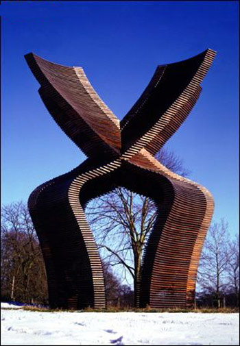 上图是赫斯维克为在曼彻斯特2002年英联邦运动会设计的“钢穗”雕塑,高56米,由180根细长的钢管组成。其倾斜度为意大利比萨斜塔的10倍以上。(图片来源:863p.com)